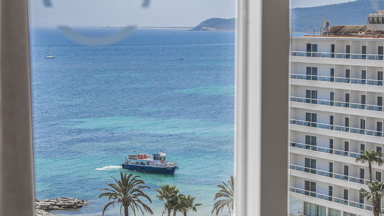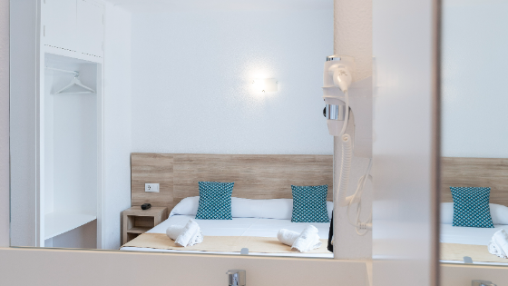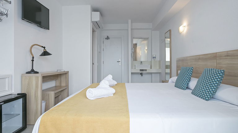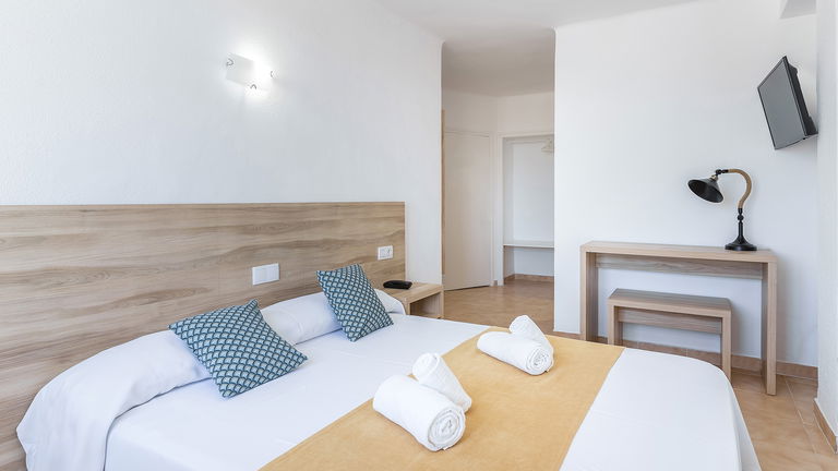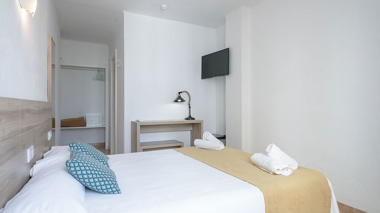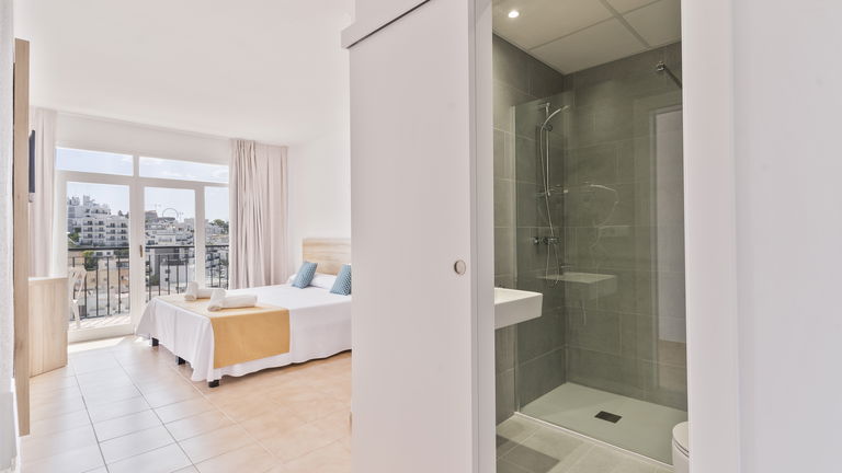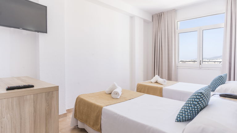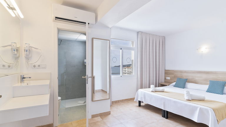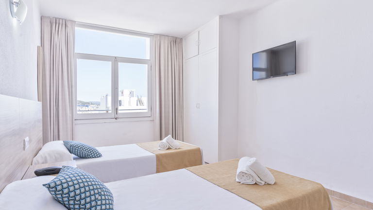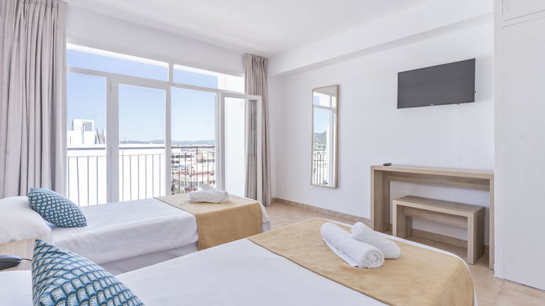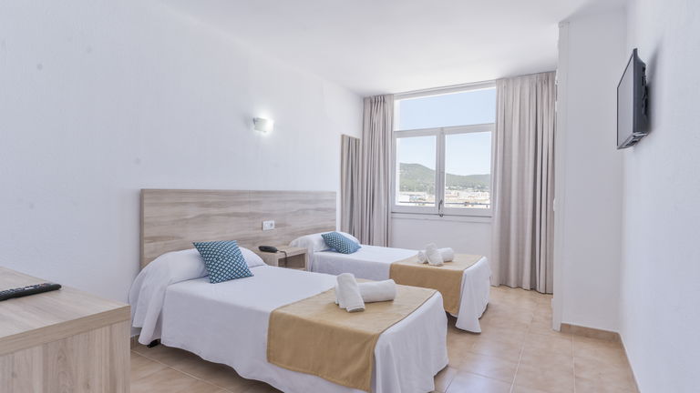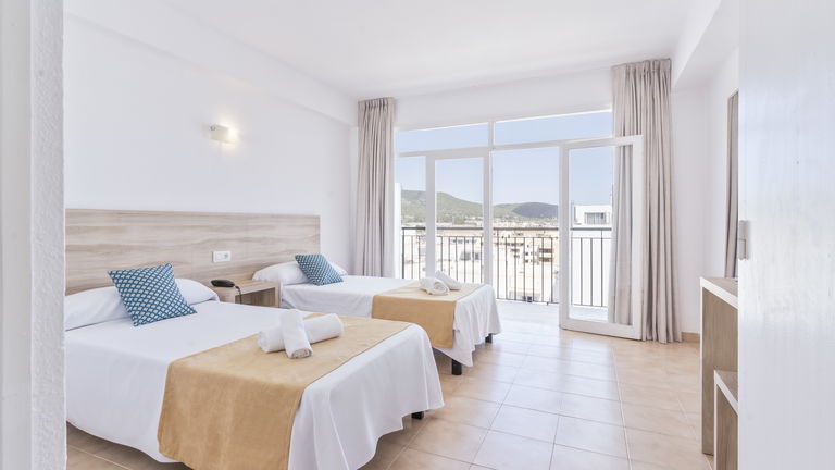 Wake up to the Ibizan sunshine from your private balcony overlooking the hills. The bright and spacious room features two single beds designed for sharing without sacrificing comfort. Perfect for friends, families, or traveling companions, it combines functionality and Mediterranean charm.