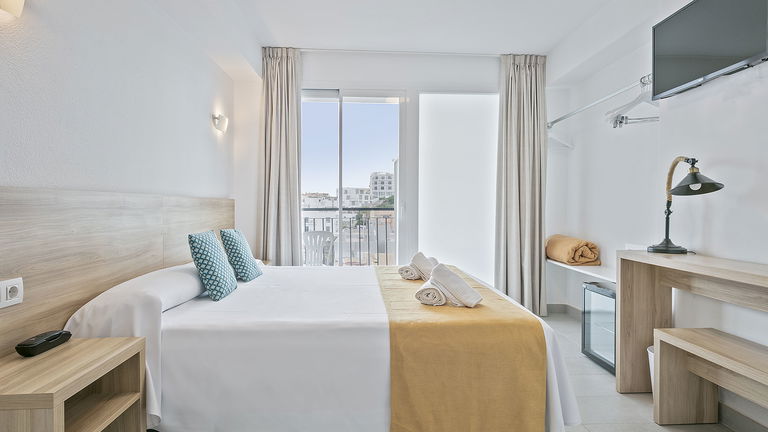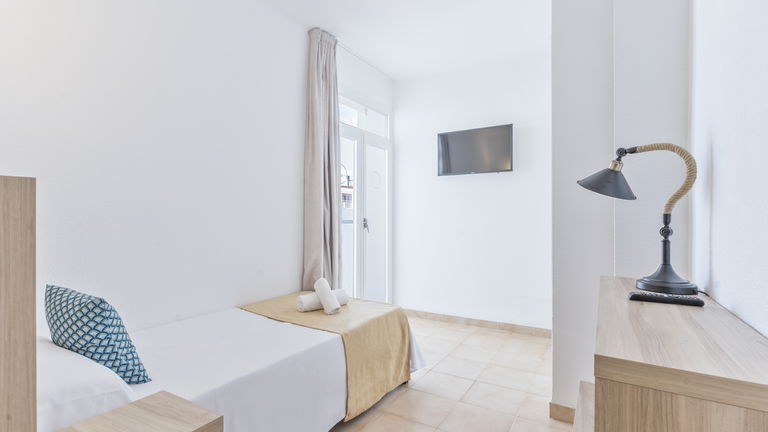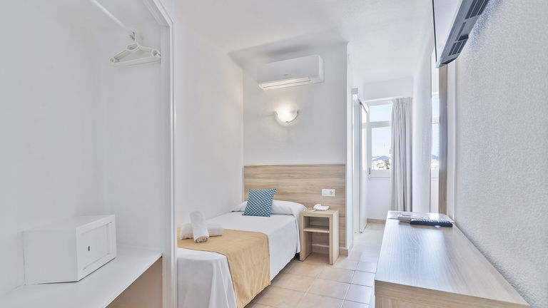 Your personal retreat in Ibiza: a bright room with a single bed, private balcony, and all the amenities. Ideal for solo travelers seeking relaxation, functionality, and tranquility, whether for work or pleasure.